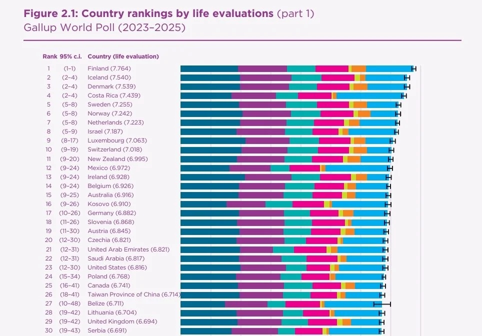 The Nordic countries retain the top spots in the world happiness rankings, Finland is No.1 (again!), followed by Iceland then Denmark; Costa Rica has jumped to 4th place.